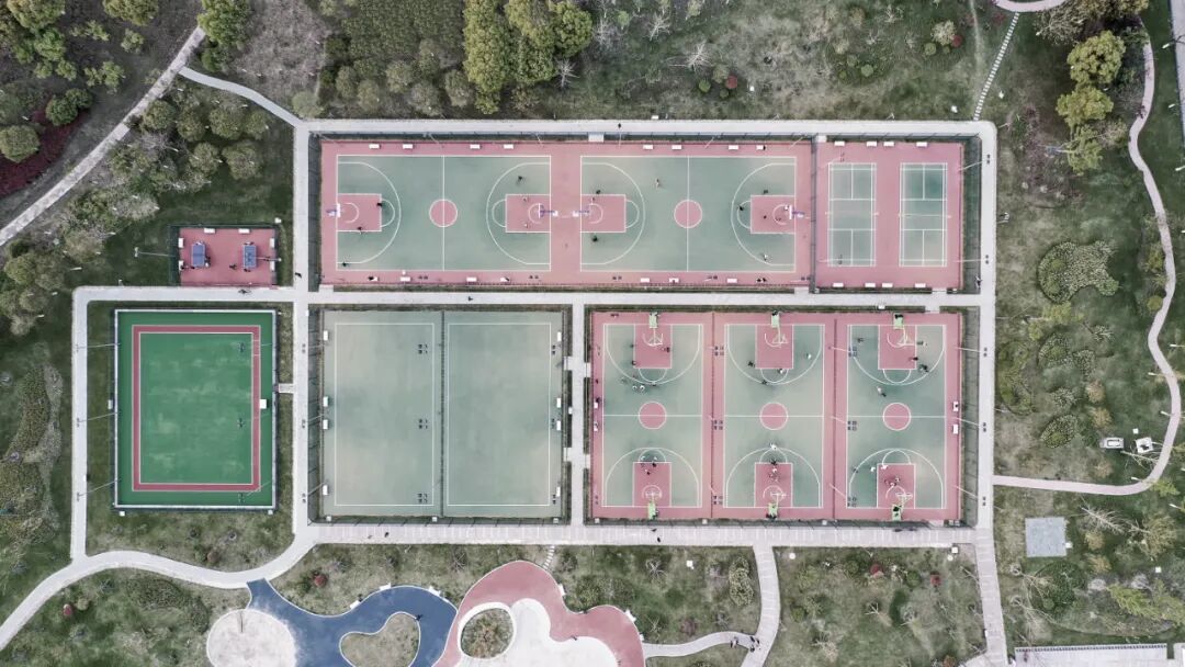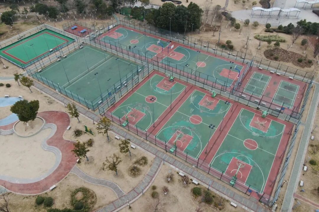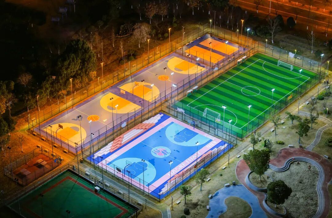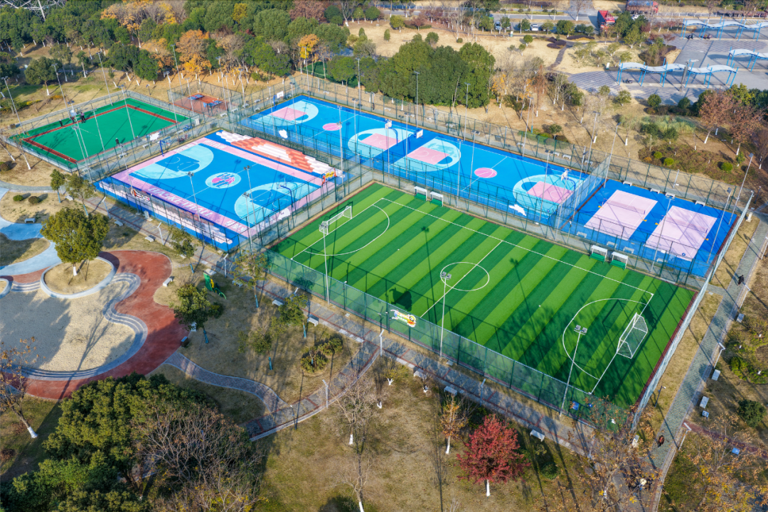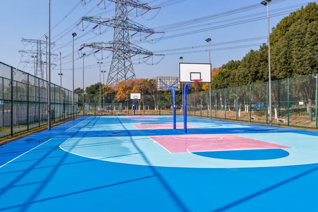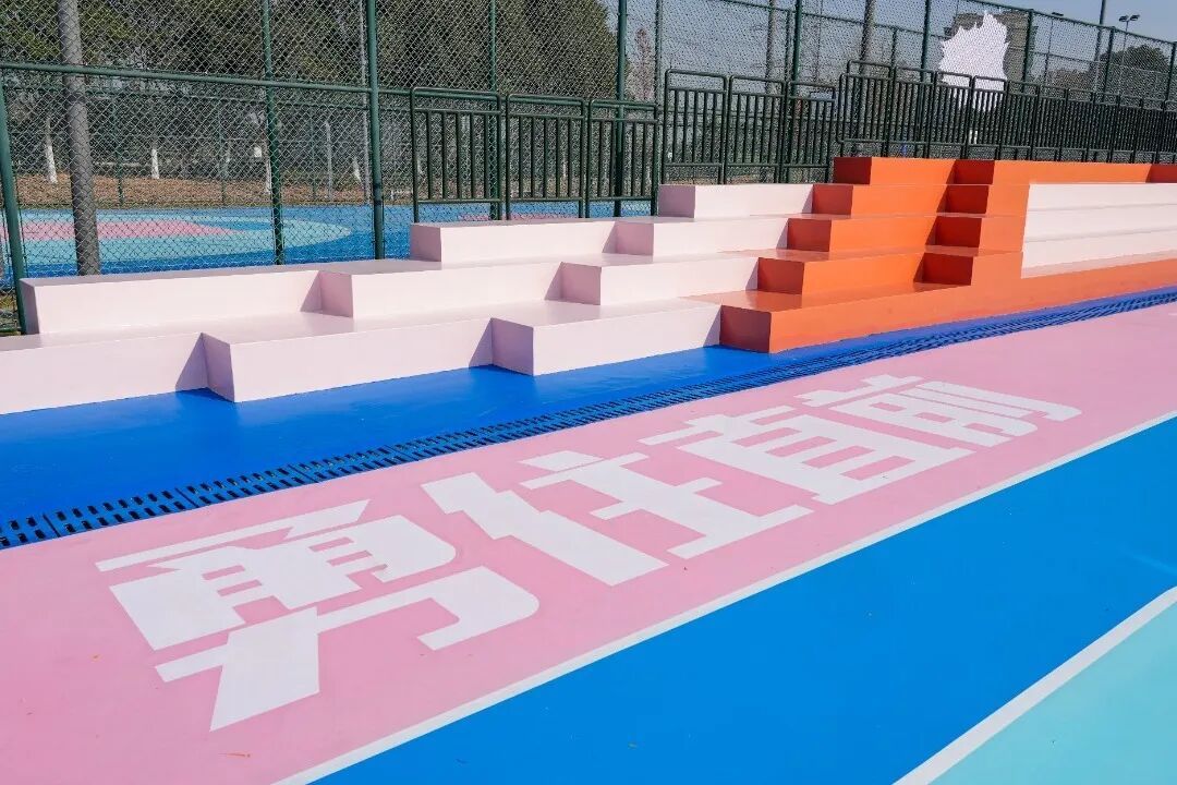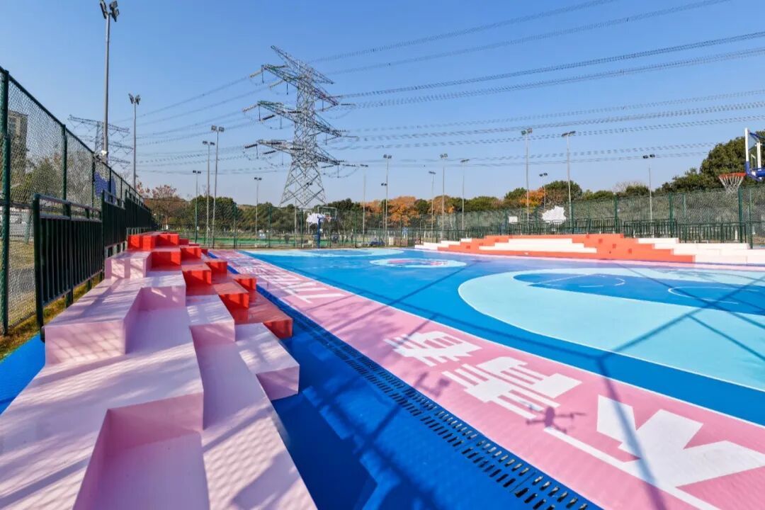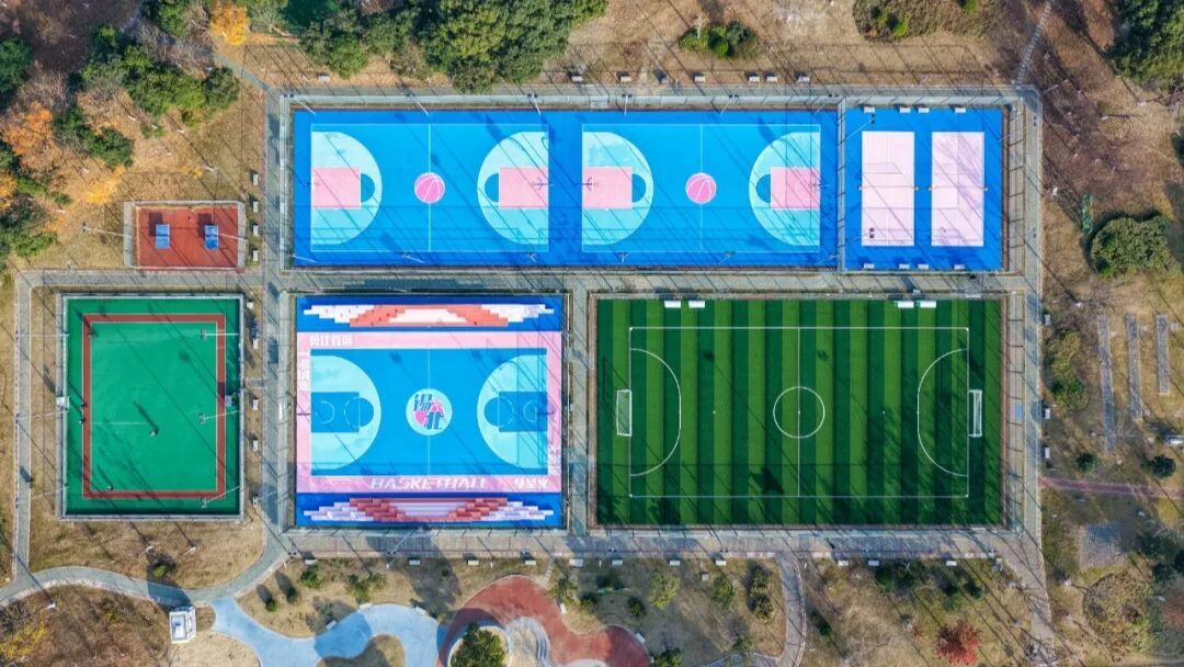 学习杭州亚运会场馆和无锡马拉松赛道配色经历,本次改造立异选用蓝色与粉色的磕碰色系,运用于篮球、茸毛球场所上,兼具运动生机与艺术美感,球场所上选用保护成本低、颜色丰厚的耐磨硅PU,构成激烈视觉记忆点,不只强化了运动活动场所的辨识度,也成为宣扬锡北镇形象的明显颜色手刺。